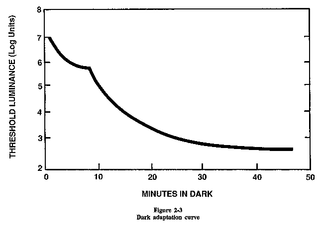 Časový priebeh adaptácie na tmu po vystavení ostrému svetlu je ilustrovaný na obrázku 2- 3. Z počiatku je citlivosť sietnice veľmi nízka, ale jej citlivosť vzrastá v priebehu jednej minúty až desaťnásobne. Po dvadsiatich minútach narastá je citlivosť 6000- násobne a po ubehnutí štyridsiatich minút dokonca 25 000- násobne. Diagr